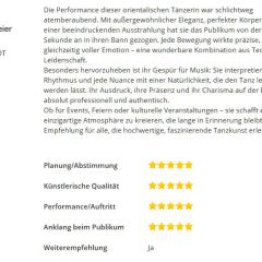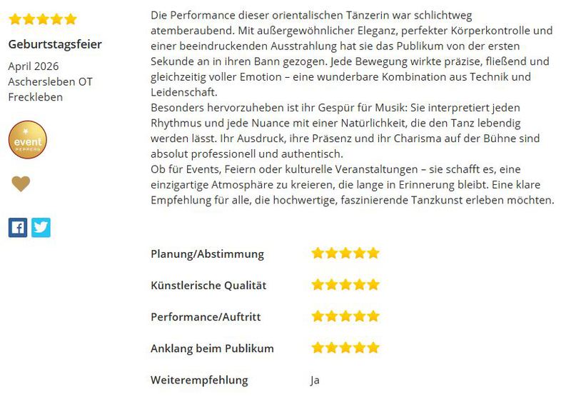 Sie möchten Ihren Gästen etwas ganz Besonderes bieten und suchen für Ihre Veranstaltung ein außergewöhnliches Highlight? Dann sind Sie auf meiner Homepage genau richtig! Hier erfahren Sie alles zu mir und meiner Leidenschaft dem Orientalischen Tanz und erhalten einen Überblick über die Buchungsmöglichkeiten.