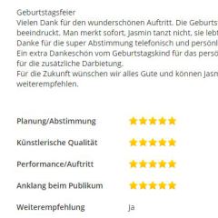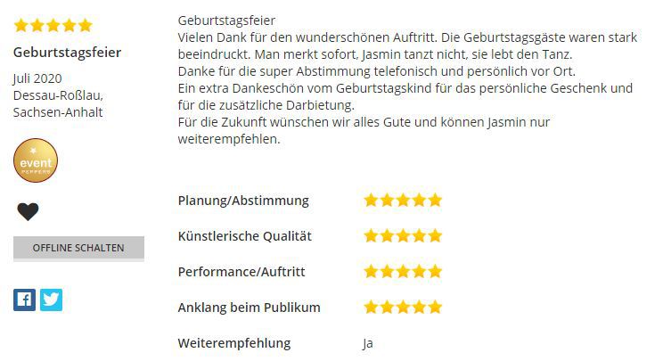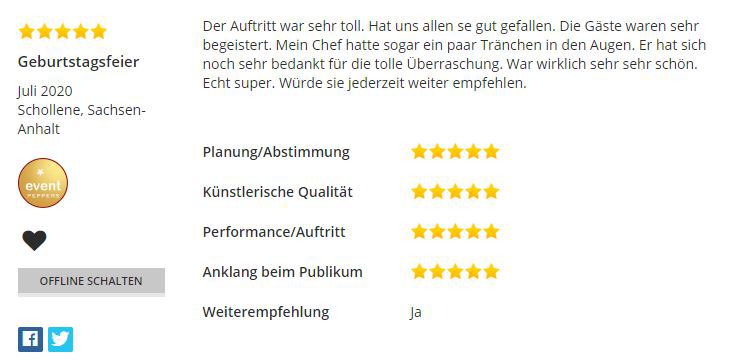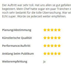 Sollte Ihr Event auf ein bereits gebuchtes Datum fallen, fragen Sie gerne trotzdem an, ich mache bis zu drei Auftritte am Tag/Abend.